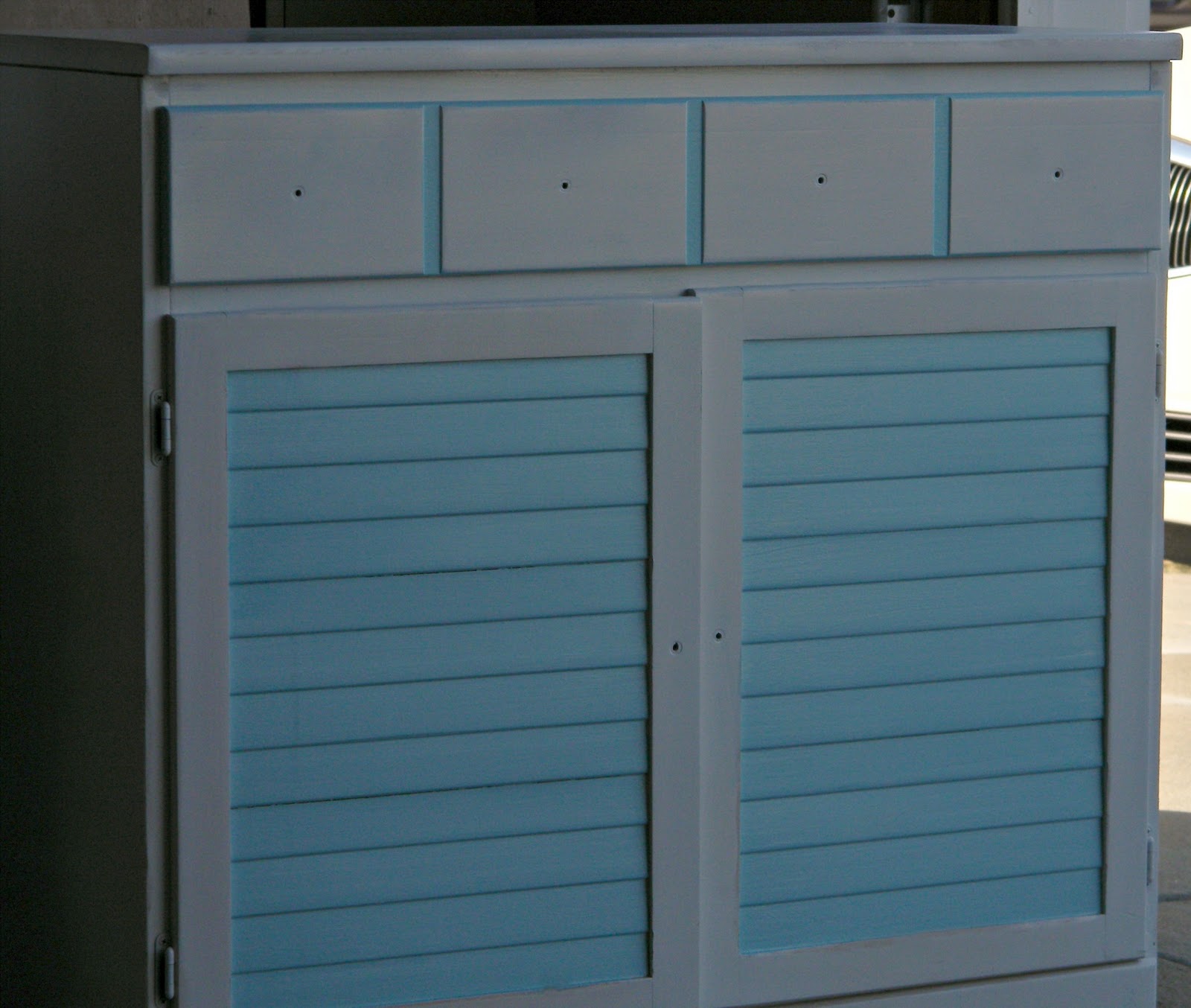 And it was boring. So... I grabbed some paint I'd bought for the bathroom vanity bug ruined and some other paint I bought to finish the walls in his room, mixed them together, and painted the inside of the doors and the indented areas on the drawer. Then, I couldn't stop... so I painted the inside of the doors, the shelves and the inside of the drawer.