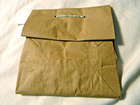 Anyway, we shoved the gift in the little lunch bag, folded the top over once, than folded it down a lot more, laid the tag over it, punched two holes, threaded the twine through (twice), added the tag through one hole, and tied in a bow.  Done.