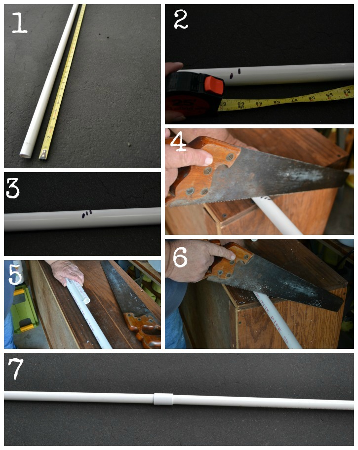 4. then used a hand saw to cut the pipe on that mark. Actually, my dad did all the cutting. I can't cut a straight line with a hand saw to save my life. So if any weird psycho killer tells me I better cut the wood for his shelf or else, I'm screwed.
