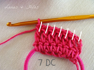 Row 2> 3 chains (counts as first dc). Make dc over the sc´s below (Total: 7 st)